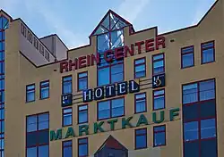 Unweit der Dreiländerbrücke auf einer Parzelle zwischen dem Rheinufer, der Landesgrenze und der Hauptstraße sowie der Colmarer Straße befindet sich der Gebäudekomplex des am 23. April 1991 eröffneten Rheincenters,[15] eines Einkaufszentrums mit überregionalem Einzugsgebiet aller drei Länder. Das Einkaufszentrum beherbergt auf mehreren Ebenen neben einem mehrstöckigen Parkhaus für über 1000 Fahrzeuge über 50 Geschäfte, zwei Hotels und ein Kino.