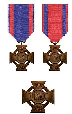 Das Ordensband ist dunkelblau mit ponceauroten Seitenstreifen. Nichtkämpfer erhielten das Kreuz am umgekehrten Band – ponceaurot mit blauen Seitenstreifen.