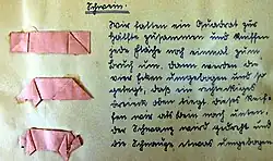 Weil es 1945/1946 noch keinerlei „neue“ Lehrbücher gab, verwendeten die Ausbilderinnen eigene möglichst neutrale Unterlagen – beispielsweise Veröffentlichungen von William Stern – und schrieben die Inhalte an die Tafel. Die Schülerinnen schrieben alles ab und schufen sich damit eigenes Lehrmaterial. Ein schönes Beispiel aus einem handgemachten Lehrheft „Basteln“ zeigt die folgende Abbildung: