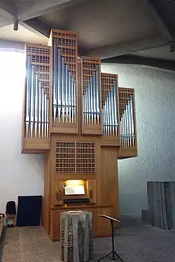 Warme Farbtöne bringen die Rieger-Orgel von 1983 und die künstlerisch auf den Raum abgestimmten farbigen Altarbehänge (1995) in die Kirche. Die Orgel steht ebenerdig neben den Prinzipalien und hat einen Umfang von 24 Registern, verteilt auf zwei Manuale und Pedal.