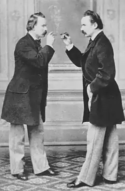 Friedrich Brandseph reicht Friedrich Brandseph Feuer, eine Doppelgänger-Trickaufnahme um 1868 entstanden, bei genauem Hinschauen sieht man in der Bildmitte die Verbindung zweier Fotos, deren Schnittstelle mit Rauch etwas retuschiert wurde