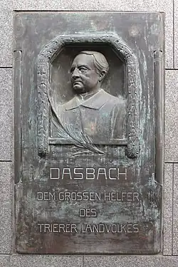 Eine Gedenktafel am ehemaligen Raiffeisenhaus in der Trierer Glockenstraße erinnert an ihn. In selbiger Straße befindet sich seit 1984 auch ein nach ihm benannter Brunnen. Seit 1948 trägt eine Straße des Industriegebietes in Trier-Nord Dasbachs Namen.[17]