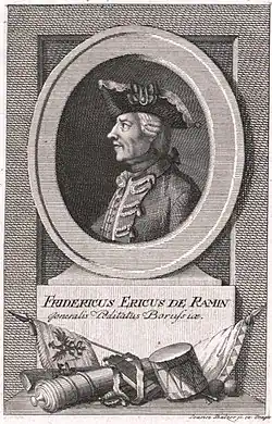 - ↑ Notiz der Spenerschen Zeitung vom 27. Mai 1747, Nr. LXIII, …,Nach der gestrigen Revue des Kalcksteinschen Regiments haben S.M. mit dem Orden p.l.m. begnadet...Friedrich Ehrenreich von Ramin...'