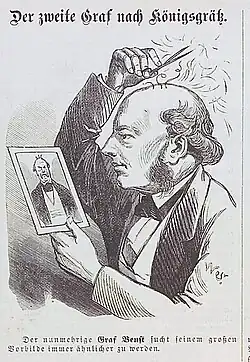 Beust war vom 30. Oktober 1866 bis 1871 österreichischer bzw. österreichisch-ungarischer Außenminister, ab dem 7. Februar 1867, vor Abschluss des Ausgleichs mit Ungarn, bis zum Ende des Jahres auch österreichischer Ministerpräsident. Als dieser führte er im Februar 1867 den Ausgleich mit Ungarn durch und leitete die konstitutionelle Verfassung ein. Er führte ab dem 23. Juni 1867 zusätzlich zur Funktion des k.u.k. Außenministers auch den Titel des Reichskanzlers.[2] Nach seinem Ausscheiden erlosch diese Amtsbezeichnung.