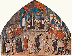 Den Kurfürsten missfiel die Annäherung Friedrichs an den Papst. Am 24. Januar 1446 ließ dieser daraufhin die Erzbischöfe von Trier und Köln absetzen, doch stärkte er damit nur die Opposition. Die anderen Kurfürsten solidarisierten sich mit ihren abgesetzten Amtskollegen und schlossen sich am 21. März 1446 zum Kurverein zusammen. Nach zahlreichen Verhandlungen erklärte sich der Papst bereit, die Absetzung der beiden Erzbischöfe aufzuheben und die meisten Konzilsdekrete zu erfüllen. In diesem Konflikt hielt sich Friedrich als Reichsoberhaupt weitgehend zurück. Im Februar 1447 erkannte der Großteil der Fürsten in den sogenannten Fürstenkonkordaten Eugen IV. an. Am 17. Februar 1448 schloss Friedrich mit Eugens Nachfolger Nikolaus V. das Wiener Konkordat, das für die Beziehungen der römischen Kurie zum Reich bis zu dessen Ende 1806 gelten sollte.[28] Das Konkordat regelte das Verhältnis der Reichskirche zum Heiligen Stuhl. Dem Papst sprach es Einkünfte im Reich zu, die erheblich umfangreicher waren als in Frankreich, sowie Eingriffsmöglichkeiten bei kirchlichen Ämtern und Pfründen. Damit sollte der Personalbedarf des päpstlichen Hofes gedeckt und der steigende Geldbedarf der Bürokratie verringert werden.[29] Das Basler Konzil dagegen verlor zunehmend an Bedeutung. 1449 zog es sich nach Lausanne zurück, am 25. April 1449 löste es sich auf.