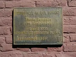 - seit 1816 geplant; Ziegelmauerwerk; erste Turnhalle im Rheinland; im 2.WK russische Kriegsgefangene interniert, sie schnitzten Holzflugzeuge, -tiere, u. a. für 2 Brote.[3] 2011 fungiert die 1992 restaurierte Turnhalle als Sportstätte für Tanzvereine. Eine Tafel der Stadt Aachen erinnert an den Architekten Friedrich Joseph Ark. Das symmetrisch in basilikaler T-Form angelegte Gebäude bestehend aus einer großen Mittelhalle und zwei kleineren Anbauten ist ca. 35/40 m lang und 34 m breit. Die beiden Seitenhallen befinden sich an der Frontseite, sie durchschneiden die Mittelhalle nicht, sondern wurden separat angebaut. Dem giebelständigen Mitteltrakt schließt sich zu jeder Seite ein niedrigerer traufständiger Seitentrakt an. Ein rundbogiges Eingangsdoppelportal unter einem Drillingsfenster in der Mitte bildet mit je einem Rundbogenfenster rechts und links unter je einem Rundfenster die Front des Hauptbaus. Die Seitengebäude haben je drei niedrigere Rundbogenfenster und eine Tür. Die Mitte misst 18 m und die beiden Seitentrakte je 8 m Breite. Das Innere des Mitteltrakts überspannt ein offenes Satteldach. Der Mittelbau wird von je 7 hohen Rundbogenfenstern an den Seiten beleuchtet. Die Rückseite ist bis auf eine zugemauerte Mitteltür verklinkert.