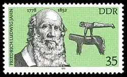Johann Friedrich Ludwig Christoph Jahn, bekannt als Turnvater Jahn (* 11. August 1778 in Lanz, heute Landkreis Prignitz; † 15. Oktober 1852 in Freyburg an der Unstrut), war ein deutscher Pädagoge, nationalistischer Publizist und Politiker. Er initiierte die deutsche Turnbewegung, die mit der frühen Nationalbewegung verknüpft war, um die deutsche Jugend auf den Kampf gegen die napoleonische Besetzung vorzubereiten. Aus dem von ihm begründeten Turnen ging unter anderem die heutige Sportart Gerätturnen hervor. Zahlreiche Turngeräte wie beispielsweise das Reck und der Barren wurden von ihm eingeführt. 1848 wurde Jahn Mitglied der Frankfurter Nationalversammlung. Er war einer der Ideengeber für die Gründung der Urburschenschaft.[1][2]