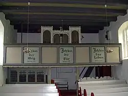 II/P | 9 | Die Orgel ist erhalten. Sie wurde 1999 restauriert durch die Firma Wolter aus Zudar (Rügen).[28][29] Orgel |