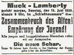 Im Mai 1920 begann unter Führung von Muck-Lamberty eine Gruppe Jugendlicher von der Stadt Hartenstein im Erzgebirge aus einen Zug durch Franken und Thüringen. Erstes Ziel war das Pfingsttreffen der Wandervögel im oberfränkischen Kronach. Dort rief Muck zur Gründung der „Neuen Schar“ auf und zog anschließend mit der Gruppe über Coburg, Sonneberg, Saalfeld, Rudolstadt, Jena, Weimar, Erfurt und Gotha nach Eisenach zur Wartburg.[6] Muck beschrieb den „Zweck der Wanderung: Sammlung aller jungen Menschen und Kampf für die Volksgemeinschaft gegen alles Gemeine, gegen Ausbeutung.“[7]