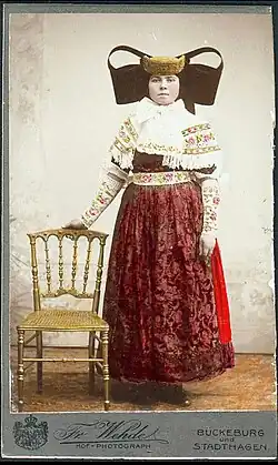 - ↑ Vergleiche Reinhard Krause: historicbits / Photography collected by Reinhard Krause / Bückeburger Tracht / Carte de Visite, Fashion, Handcolored, Photostudio auf der Seite archive.reinhard-krause.de, zuletzt abgerufen am 2. Mai 2017