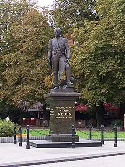 - Auf dem damaligen Redenberg in Königshütte wurde ihm ein Denkmal gesetzt. Das Bronze-Standbild von Redens in Bergmannsparadeuniform wurde von Theodor Kalide (1801–1863) entworfen und ausgeführt und 1853 eingeweiht. Nach dem Übergang Ostoberschlesiens an Polen 1922 wurde es kritisiert, seine Berechtigung infrage gestellt und 1939 schließlich beschädigt. Nach Restaurierung im Jahr 1940 erfolgte die Neuaufrichtung 1941. Infolge des Übergangs von Schlesien an Polen wurde es nach dem Zweiten Weltkrieg 1945 abgebrochen und eingeschmolzen (nur der Kopf ist erhalten). Erst im Jahr 2002 wurde eine Nachbildung von Kalides Bronzestatue auf dem Hüttenplatz aufgestellt, die August Dyrda ausführte.[5][6] 2002 wurde dort das von Reden-Denkmal erneut eingeweiht, jedoch nur mit polnischsprachiger Inschrift.