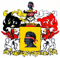 1859: In Gold ein rechtsgewendetes, natürliches Mohrenhaupt, dessen Augen mit einer von Rot und Silber gestreiften, nach hinten abfliegenden Binde bedeckt sind. Auf dem Schild ruht die Freiherrnkrone, auf dieser ein Helm, dessen Krone das vorbeschriebene Mohrenhaupt trägt. Die Helmdecken sind rechts schwarz mit Gold, links rot mit Silber unterlegt. Die Schildhalter bilden zwei auf einer goldenen Arabeskenverzierung stehende silberne Greife, deren Köpfe, Hälse, Mähnen, Brüste und Flügel rot sind.[2]