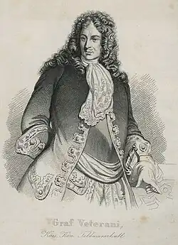 Der gebürtige Italiener dürfte schon in frühen Jugendjahren in die kaiserliche Armee eingetreten sein. Ein am 12. Februar 1682 ausgestelltes Offizierspatent bezieht sich auf bis dahin geleistete Kriegsdienste und Kriegserfahrung. Während der Zweiten Wiener Türkenbelagerung verteidigte Veterani als Oberst mit 1000 Kürassieren eine der Donaubrücken.[2] Im darauf folgenden Großen Türkenkrieg nahm Veterani an mehreren Feldzügen teil. 1684 tat er sich unter dem Befehl von Feldmarschall Antonio von Caraffa im Kampf um die Festung Neuhäusel hervor, wo er mehrere von feindlichen Truppen unter Emmerich Thököly eingeschlossene Regimenter befreite. Im Jahr darauf hatte Veterani maßgeblichen Anteil an der Eroberung von Eperies, woraufhin er am 12. September 1685 zum Generalfeldwachtmeister befördert wurde. 1686 erwarb er sich bei der Eroberung von Szegedin wiederum hohe Verdienste. Am 13. Juli 1688 wurde Veterani zum Feldmarschallleutnant ernannt, kurz darauf marschierte er mit seinen Truppen unter dem Befehl von Ludwig Wilhelm von Baden-Baden entlang des rechten Donauufers auf Belgrad zu. Im Gefecht von Widdin 1689 wurde er durch eine Musketenkugel verwundet und erhielt in weiterer Folge das Kommando über die Festung Nissa, welche er erfolgreich gegen mehrere Angriffe verteidigte. Am 16. August 1690 wurde er zum General der Kavallerie befördert, im Jahr darauf übergab er das Festungskommando an Guidobald von Starhemberg und stieß wieder zur Hauptarmee unter Ludwig Wilhelm von Baden-Baden, in dessen Abwesenheit er bisweilen selbst den Oberbefehl führte.