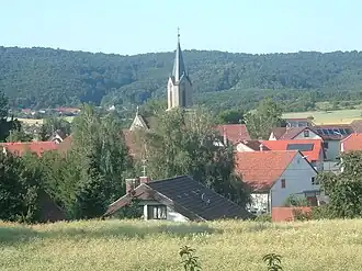 ![]() Friesenhausen von Südosten gesehen: In der Mitte der neugotische Turm der evangelischen Pfarrkirche, im Hintergrund die Haßberge.