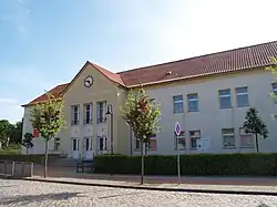 Das zweigeschossige Gebäude mit dem markanten Giebelrisalit und einem Walmdach wurde in der DDR-Zeit vermutlich Ende der 1950er Jahre als Oberschule gebaut. Eine Wandmalerei ziert das Treppenhaus.