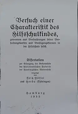 Rössel wies zudem darauf hin, dass er sich 'in Beruf und persönlichem Leben ohne Vorbehalt nach bestem Wissen und Gewissen für die Arbeit im neuen Reich' eingesetzt habe; seine Lehrveranstaltungen und Forschungen auf seinem Spezialgebiet, der Hilfsschulpädagogik, hätten seit 1933 der 'Durchdringung der Bildungsarbeit mit nationalsozialistischem Gedankengut' gedient, wobei er sich besonders auf die eugenische Erziehung konzentriert habe. Den Sozialhelferdienst habe er zum Volkshelferdienst fortentwickelt. Er könne nun auch in nationalsozialistischen Formationen wie der HJ oder dem Landesdienst geleistet werden.[2] Trotz seines Anpassungsversuchs und der Intervention des von den Nationalsozialisten geschätzten Landesschulrats Wilhelm Schulz musste Rössel die Universität verlassen.