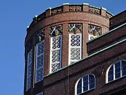 Der mit Oldenburger Klinkern verblendete Stahlbetonbau trägt einen reichen Fassadenschmuck aus farbig emaillierter Keramik von Richard Kuöhl, mit dem Schumacher eng zusammenarbeitete.