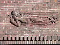 Der Bau liegt auf einem im gleichen dunklen Klinker ausgeführten Sockel. Der gesamte Bauschmuck mit Keramik wurde wiederum von Richard Kuöhl ausgeführt. Bemerkenswert ist die Großplastik des schwebenden Engels, die aus speziell geformten Klinkern zusammengesetzt ist.
