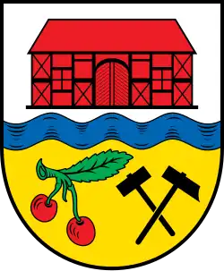 Blasonierung: „Vertikal durch ein blaues Wellenband geteilt, in der oberen Hälfte ein roter Gutshof auf silbernem Grund, unten zwei rote Kirschen mit grünem Blatt und zwei überkreuzte Berghämmer auf goldenem Grund.“[10] |