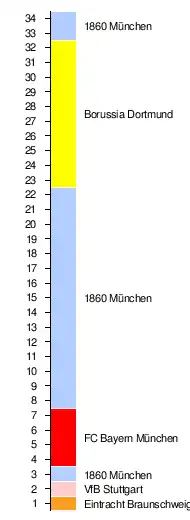 1860 München dominierte die erste Saisonhälfte und lag vom 8. bis zum 22. Spieltag ununterbrochen auf Platz eins. Mit einer Hinrundenbilanz von 29:5 Punkten stellten die Löwen einen Rekord auf, der erst in der Saison 2005/06 vom FC Bayern München überboten wurde (44 Punkte nach 3-Punkteregel, 30:4 nach 2-Punkteregel). Nach einer Schwächephase in der Rückrunde fiel die Mannschaft jedoch zwischenzeitlich hinter Borussia Dortmund und den FC Bayern München auf Rang drei zurück. Dortmund übernahm am 23. Spieltag die Tabellenführung, verlor jedoch nach dem Europapokalsieg in Glasgow die letzten drei Partien. Der 2:0-Sieg der Löwen in Dortmund am vorletzten Spieltag brachte für den TSV 1860 München die erneute Tabellenführung und die Vorentscheidung in der Meisterschaft.