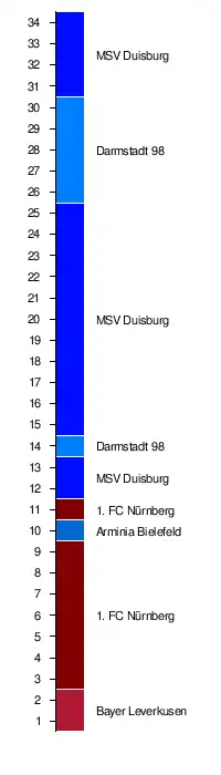 | 18. | MSV Duisburg | 1:2 | 1:0 | 2:3 | 3:1 | 0:1 | 1:2 | 0:1 | 4:2 | 1:2 | 1:0 | 5:2 | 1:3 | 3:2 | 1:1 | 2:1 | 2:1 | 0:2 | |