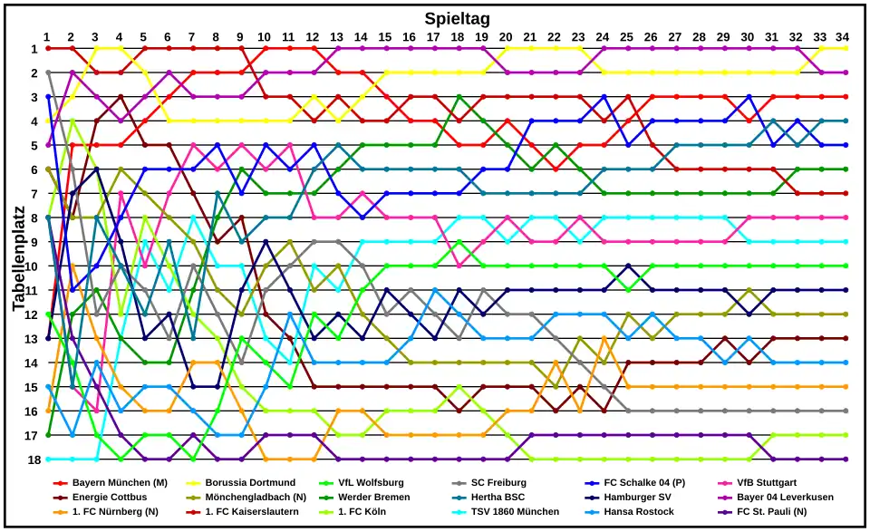 Auffällig in dieser Saison war das starke Punktegefälle zwischen der Spitze und der Abstiegszone: Fünf Mannschaften mit mehr als 60 Punkten gab es bis dahin seit Einführung der Drei-Punkte-Regel 1995 nie[1], für den Einzug in den UEFA-Cup reichten 56 Punkte (Kaiserslautern auf Platz 7) nicht aus. Auf der anderen Seite sicherten sich Nürnberg und Rostock mit 34 Punkten den Ligaverbleib, wobei sogar 31 Punkte für den Klassenerhalt gereicht hätten.