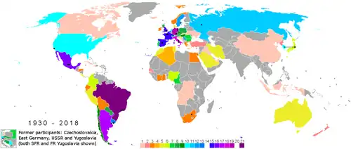 | Teilnehmer | 1930 | 1934 | 1938 | 1950 | 1954 | 1958 | 1962 | 1966 | 1970 | 1974 | 1978 | 1982 | 1986 | 1990 | 1994 | 1998 | 2002 | 2006 | 2010 | 2014 | 2018 | 2022 | Total | Endr. | 1 | 2 | 3 | 4 | V | Z | A | X | |