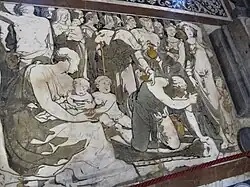 Die 1481 entstandene und 1482 bezahlte Szene wurde von Francesco di Niccolaio und Nanni di Piero di Nanni nach einem Entwurf von Matteo di Giovanni gestaltet und 1790 von Matteo Pini und Carlo Amidei restauriert. Die lebendige Szene spielt sich vor einem hufeisenförmigen Portikus ab, auf dem sich ein wertvolles Fries aus Duellanten im klassischen Stil befinden. Auf runden Balkonen verfolgen einige Zuschauer die Veranstaltung mit einem Hauch von Selbstzufriedenheit und Spaß, als wären sie im Theater. König Herodes sitzt auf einem prächtigen Renaissance-Thron aus geschnitztem Marmor und befehligt seinen Soldaten das Massaker. Die Technik unterscheidet sich von derjenigen im Kirchenschiff, indem eine größere Anzahl farbiger Marmore verwendet wird, um Schatten- und Lichtbereiche zu schaffen. Nach einem Verfahren, das perfektioniert wird und das in den von Beccafumi entworfenen Szenen seinen Höhepunkt findet. |