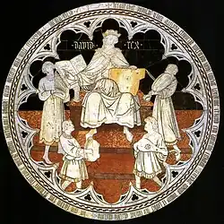 Die gleiche Hand ist auch für das große Medaillon in der Mitte verantwortlich, mit David der Psalmist, d. h. David als König, der sich der Komposition von Psalmen in einem offenen Buch über ein Rednerpult widmet, begleitet von einem Vibraphon und vier Kindern mit vier Musikinstrumenten: Akkordeon, Tamburin, Laute und Bratsche. Sie sind symmetrisch auf Stufen um den König herum angeordnet. Entlang des mit dreilappigen Bögen verzierten Rahmens verläuft eine lange Inschrift mit einer Hand, die den Ausgangspunkt anzeigt. Alle diese Figuren wurden von Matteo Pini nach einem Entwurf von Carlo Amidei 1777 überarbeitet. |