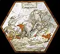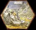 1878 | Das nächste Sechseck zeigt die Erfüllung der Prophezeiung. Ahab, der versucht hatte sich unter seinen Soldaten zu verstecken, wurde dennoch von einem zufällig abgefeuerten Pfeil unterhalb der Rüstung getroffen. Die Szene zeigt die letzten Momente des Königs, während er von der Kriegswagen aus auf die Entwicklung der Schlacht schaut. Der heilige Text schreibt: „Da aber die Schlacht an jenem Tag heftig wurde, blieb der König im Kampf gegen die Aramäer aufrecht im Wagen stehen. Am Abend starb er. Das Blut der Wunde war in das Innere des Wagens geflossen. Bei Sonnenuntergang ließ man im Lager ausrufen: Jeder kehre in seine Stadt, in sein Land zurück! So starb der König; man brachte ihn nach Samaria und begrub ihn dort. Als man im Teich von Samaria den Wagen ausspülte, leckten Hunde sein Blut und Dirnen wuschen sich darin, nach dem Wort, das der HERR gesprochen hatte.“ (1. Könige, 22, 35–38). Es sind tatsächlich Hunde dargestellt, die das tropfende Blut lecken. Eine weitere Szene von Franchi, die mit einem ausgewogenen Rückgriff auf Emotionen ohne pathetische Töne gelöst wird. |