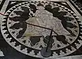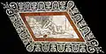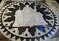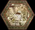 Unbekannt | ca. 1374 | nach 1865 | Die Darstellung ist dekorativer und stellt ein Rad, bzw. eine große Domrosette aus kleinen Säulen und Spitzbögen dar. Im Zentrum steht der Doppeladler, Wahrzeichen des Heiligen Römischen Reiches, der an die ghibellinische Loyalität der Stadt, die Kontinuität Sienas zur römischen Welt und die Bedeutung der höchsten Bürgermacht des Mittelalters erinnert. Obwohl diese Fläche im 19. Jahrhundert vollständig renoviert wurde, ist sie stilistisch gesehen auf eine Zeit unmittelbar nach der Wölfin zu datieren. | |