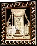 Geschichte der Judith | Francesco di Giorgio Martini oder Urbano da Cortona (Entwurf zugeschrieben) | 1473 | 1790 | Dieses Panel zeigt auch eine weitreichende Szene, umgeben von einem „Naspi“-Fries, die in Tizios Chronik Urbano da Cortona zugeschrieben wird, der 1473 daran arbeitete. Neuere Studien, wie die von Carli, haben stattdessen den Namen Francesco di Giorgio Martini aufgrund enger Ähnlichkeiten, wie die Figur der Judith und die vielen jungen Mädchen, die der sienesische Meister gemalt hat, oder wegen der so „idealen“ Umgebung für den Blick auf die Stadt, erhalten. Die Szene, die 1790 von Carlo Amidei und Matteo Pini umfassend restauriert wurde, erzählt die Geschichte von Judith von Betulia. Um ihre eigene Stadt zu retten, tötet sie den Anführer der assyrischen Belagerungen, nachdem sie ihn in seinem Lager betrunken gemacht hat. Sie ist dargestellt während sie mit ihrer Magd in die Stadt, mit dem Kopf des Tyrannen in einem Korb, zurückkehrt. Währenddessen wirft sich vor den Mauern die jüdische Kavallerie in einen siegreichen Kampf gegen Feinde ohne Kommandanten. Es gibt zahlreiche klassische Zitate, vor allem in der Architektur, verziert mit Girlanden und Grabsteinen mit humanistischen Büsten. |
