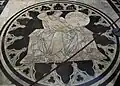 Dies sind sehr alte, oft veraltete, Symbole und wahrscheinlich so gewählt, dass sie eine abwechslungsreiche Serie darstellen: Rom zum Beispiel wird nicht als Kapitolinische Wölfin gewählt, dass ähnlich der sienesischen ist. An den vier Ecken befinden sich weitere Kreise mit dem Löwen von Massa Marittima, dem Adler von Volterra, dem Drachen von Pistoia und dem Gänsegeier von Grosseto. Abgesehen von Rom sind die ausgewählten Städte idealerweise Teil des Territoriums der Toskana, einschließlich der Städte, die sich heute in Umbrien oder im oberen Latium befinden. Dieses Paneel ist das einzige im Mosaik von dem es im Museo dell'Opera del Duomo noch einige sehr abgenutzte Originalstücke gibt. Sie geht bis ins Jahr 1373 zurück, passend zu den gotischen Inschriften der Darstellung. Es stammt von einem unbekannten Autor und wurde 1864–1865 von Leopoldo Maccari erneuert. |