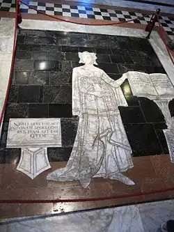 | Tapferkeit | Martino di Bartolomeo | 1406 | 1823–1839 | Um den Altar herum, im Chor, befindet sich eine Serie von fünf Kreisen mit den Kardinaltugenden: Tapferkeit, Gerechtigkeit, Barmherzigkeit, Besonnenheit und Mäßigung. Jede einzelne ist in einem Kreis aus dreilappigen Bögen platziert und hebt sich vom Hintergrund aus schwarzem Marmor ab. Um sie herum befinden sich geometrische Muster mit optischer Wirkung. Für die Tapferkeit wurde am 13. März 1406 Marchese Adam von Como und seine Gehilfen bezahlt. Sie ist mit den typischen Attributen des Schildes dargestellt, das Schwert rechts, eine Säule links. Die Gerechtigkeit hat den Globus und das gezogene Schwert. Die Barmherzigkeit, die sich auf der Achse des Schiffes befindet, ist kleiner, einfacher und sehr schwer erkennbar. Die Besonnenheit hat drei Gesichter, die alles beobachten, und eine Schlange in der Hand. Die Mäßigung hält zwei Amphoren. Carli vermutete, dass alle diese Figuren vom sienesischen Maler Martino di Bartolomeo gezeichnet wurden, der mit Jacopo della Quercia verbunden war. Das Restaurierung der „Tugenden“ erfolgte in den Jahren 1823–1839.[13] | |