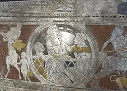 Die sienesische Wölfin zwischen den Symbolen der verbündeten Städte | Unbekannt (überarbeitet von Leopoldo Maccari) | ca. 1373 | 1864–1865 | Das zweite Panel ist um einen großen Kreis herum organisiert, der eine Darstellung der sienesischen Wölfin enthält, die die Zwillinge Senius und Aschius saugt, umgeben von Totemtieren aus einer Reihe von verbündeten Städten: das Pferd von Arezzo, der Marzocco-Löwe von Florenz, der Panther von Lucca, der Hase von Pisa, das Einhorn von Viterbo, der Storch von Perugia, der Elefant von Rom und die Gans von Orvieto