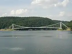 Eine Fußgängerhängebrücke ist eine Hängebrücke aus Naturfaser-, Kunstfaser- oder Stahlseilen, die ähnliche Konstruktionsmerkmale wie die großen Straßenhängebrücken hat. Über gesonderte Pylone sind Tragseile geführt, an deren Hängern ein gesonderter Träger für den Gehweg hängt, so dass der Weg über die Brücke im Prinzip horizontal verläuft.[1][2][3][4][5][6]