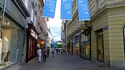 Eine Fußgängerzone (in Österreich auch Fußgeherzone, bis 2013 in Deutschland offiziell Fußgängerbereich; norddeutsch auch Gehstraße, v. a. im Kreis Dithmarschen) ist eine Verkehrsfläche, auf der Fußgänger Vorrang oder ausschließliches Nutzungsrecht gegenüber anderen Verkehrsteilnehmern haben.[1] Meist haben diese, vor allem der motorisierte Verkehr, nur zu bestimmten Zeiten (zum Beispiel zur Anlieferung von Waren oder als Anwohner) ein Zuwegerecht. Die Fußgängerzone kann aus mehreren Fußgängerstraßen bestehen und liegt meistens im Innenbereich einer Stadt, eines Stadtteils oder einer Siedlung.