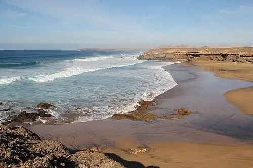 Sehr beliebt sind Strand- und Küstenwanderungen. Wie auf keiner anderen Kanareninsel kann stundenlang an unverbauten Küsten entlang gewandert werden. Von der touristischen Bebauung so gut wie vollkommen ausgespart wurde neben der Westküste auch die Nordküste der Halbinsel Jandía. Von Morro Jable aus verkehrt zweimal täglich ein öffentlicher Allradbus zum Strand von Cofete. Wegen der starken Strömung ist dieser für den Badesport nicht geeignet, man kann dort jedoch am Fuß des Jandía-Massivs bis zur Playa de Barlovento gehen.[40] Unberührte Küstenabschnitte finden sich auch südwestlich von El Cotillo und südlich von Ajuy.