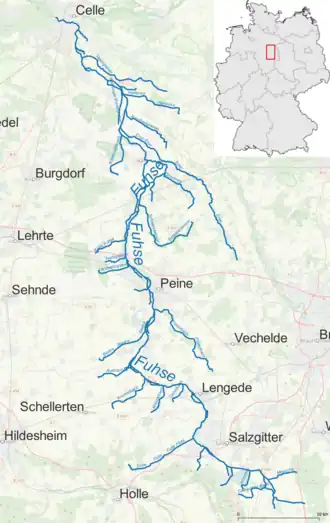 Die Fuhse entspringt an den Westhängen des Oderwalds auf dem Gebiet der Gemeinde Flöthe. Sie nimmt weitere Bäche des Oderwalds auf, die wie auch die Fuhse regelmäßig trockenfallen.[11] Von ihrer Quelle aus fließt sie zuerst ein kurzes Stück nach Westen, wendet aber schon bei Flachstöckheim ihren Lauf nach Norden. Östlich von Lobmachtersen zweigt rechtsseitig die Alte Fuhse ab, welche die Grenze zwischen dem Landkreis Wolfenbüttel und der Stadt Salzgitter bildet. Dieser Wasserlauf ist der Rest des ehemaligen Fuhselaufs, in den wegen des höher liegenden Sohlniveaus nur bei Hochwasser Wasser der Fuhse gelangt. Der obere Lauf der Alten Fuhse fällt bis zur Einmündung des Nordbachs östlich von Lobmachtersen aus diesem Grunde auch regelmäßig trocken. In die Alte Fuhse mündet westlich von Cramme noch die Meesche, die im Oberlauf Knickgraben heißt.