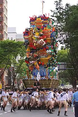 Das über 760 Jahre alte Hakata Gion-yamakasa genannte Fest des Kushida-Schreines (Kushida-jinja) findet in der ersten Juli-Hälfte statt. In den Bezirken der ehemaligen Händlerstadt Hakata werden mit historischen Puppen bestückte „Schmuck-Berge“ (kazari-yama) aufgestellt. Sieben niedrigere, nahezu eine Tonne schwere „Trage-Berge“ werden zu bestimmten Terminen durch das jeweilige Viertel bewegt. Der Höhepunkt und Schluss des Festes beginnt um 4 Uhr 49 des 15. Juli, wenn hunderte Männer mit dem „Trage-Berg“ ihres Stadtviertels über eine Strecke von etwa 5 Kilometern um die kürzeste Zeit wetteifern.