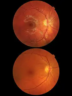 Fundusfotos zeigen den Augenhintergrund typischerweise orange-rötlich.[3] Die benötigten Kameras werden wegen ihrer hohen Spezialisierung nur von wenigen Herstellern angeboten, zum Beispiel von Topcon, Nidek, Carl Zeiss, Meditec, Canon oder Kōwa.