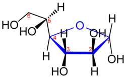 Die Atome des Fünfringes (Tetrahydrofuranring) werden derart nummeriert, dass dem anomeren Kohlenstoffatom (ursprüngliches Kohlenstoffatom der Carbonylgruppe der Aldose bzw. Ketose) stets die Position 1 zugewiesen wird. Die Position der Hydroxygruppen ergibt sich dann aus dem Lokanten des Kohlenstoffatoms, an das dieses in der acyclischen Form gebunden ist. Weitere Konventionen sind in der wissenschaftlichen Literatur beschrieben.[2]