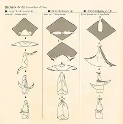 Ein Furoshiki (jap. 風呂敷) ist ein quadratisches Tuch, das vor allem in Japan traditionellerweise als Verpackung und als Tragebeutel genutzt wird, beispielsweise für Geschenke oder Kleider. Die aus der Edo-Zeit stammende Bezeichnung bedeutet ungefähr „Bade-Tuch“, weil es in öffentlichen Badehäusern damals üblich war, die eigene Kleidung in solchen Tüchern aufzubewahren, doch dürfte ähnlicher Gebrauch, etwa unter Händlern, bis auf die Nara-Zeit zurückgehen. Eine ältere Bezeichnung war hirazutsumi (平包, dt. „flaches Bündel“). Als Materialien kommen heutzutage Kunstfaser, Baumwolle oder Seide vor, die Größen sind vielfältig, üblicherweise ab etwa 45 cm bis rund 100 cm Kantenlänge.[Anm. 1] Es gibt aber auch ein Zwei-Meter-XXL-Format.[1] Furoshiki, die oft mit traditionellen Mustern bedruckt oder im Shibori-Stil gefärbt sind, werden zum Verpacken von Geschenken verwendet, aber auch zum Einpacken der in Japan häufigen Imbissbehälter (Bentō), wo sie gleichzeitig Tischset oder Serviette ersetzen. Sogar bei kleineren Umzügen werden sie statt Kartons verwendet, etwa für den Transport einer Matratze.[1]