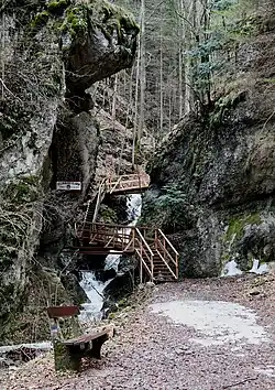 • Steinwandklamm: 1884 wurde die Klamm (Lage) für Besucher zugänglich gemacht[5] und am 8. Juni selben Jahres, unter Teilnahme von mehr als 600 aus Wien angereisten Teilnehmern[6], eröffnet.[7] Der Österreichische Touristenklub (Ö.T.K.) Triestingtal legte 1927 einen Klettersteig an. Der Satz „Wir wandern auf Kaisers Spuren“ entstand durch den Umstand, dass Kaiser Franz Joseph der wohl berühmteste Wanderer in der Klamm war. Sie wurde im Ersten und Zweiten Weltkrieg ziemlich zerstört. Heute führen gesicherte Steige und Brücken bis zum Türkenloch; dort sollen sich während der zweiten Türkenbelagerung die Bewohner des Triestingtales versteckt haben, aber nach der Entdeckung durch die Türken durch aufsteigenden Rauch alle getötet worden sein.