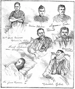 - ↑ Original: Alors, les soldats, sans avoir été provoqués par la foule, sans avoir fait les trois sommations réglementaires, tirèrent. La boucherie aurait duré encore longtemps si le curé catholique Margerin, n'était pas sorti de la maison et n'avait pas crié : " Assez de victimes ". Neuf enfants étaient couchés sur la place, un homme de 30 ans, 2 jeunes gens de 20 ans, 2 enfants de 11 et 12 ans et quatre jeunes filles de 17 à 20 ans.