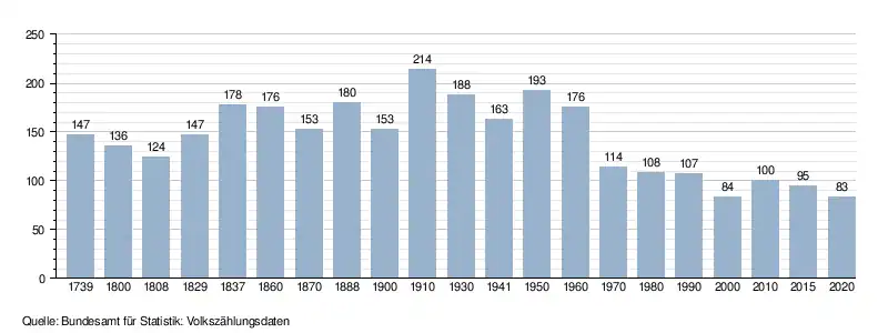 - ↑ a b Daten der Eidgenössischen Volkszählungen ab 1850 nach Gemeinden. (XLSX; 10 MB) Bundesamt für Statistik, Neuchâtel, 12. Juli 2024, abgerufen am 4. August 2025 (Öffnung in Excel nur über „Anhang/Excel-Datensatz“ möglich).