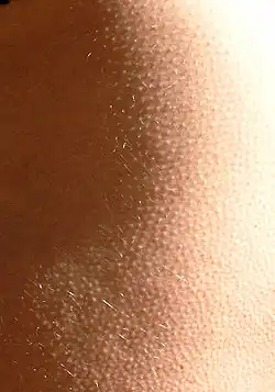 Als eine Gänsehaut (teilweise auch: Hühnerhaut oder Hinkelshaut, medizinisch: Piloerektion bzw. Piloarrektion[1], lat.: cutis anserina) bezeichnet man das typische Bild von aufgerichteter Körperbehaarung und kleiner Erhebungen der Hautoberfläche vor allem an Armen und Beinen, das dem Anblick einer gerupften Gans ähnelt. Die Ursache für das Entstehen einer Gänsehaut beim Menschen ist bis heute nicht vollständig geklärt.[2]