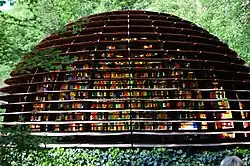 - Eine begehbare rostige Stahlkuppel, an der Plexiglasplättchen in den Farben des Herbstes schimmern, erinnert an einen Laubhaufen.
