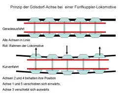 Die Funktion der Gölsdorf-Achsen besteht darin, dass einzelne Kuppelachsen in ihrer Lagerung und in ihrem Antrieb so eingebaut werden, dass sie sich bei Kurvenfahrt seitlich verschieben können, frei ausgerichtet an den Kräften, die von den Schienen auf die Räder wirken und die Lokomotive in die Kurve drehen. Zwei der fünf Achsen können ihre seitliche Position im Rahmen nicht verändern, sie sind in Festlagern gelagert. Die verschiebbaren Achsen erfordern neben der verschiebbaren Lagerung der einzelnen Achse auch die Möglichkeit zur Verschiebbarkeit der Kuppelstangen auf den Triebzapfen der verschiebbaren Achsen. Da der Antrieb nur auf eine nicht seitlich verschiebbare Achse erfolgen kann, wurde in der Regel die vierte Achse dazu herangezogen, was entsprechend lange Treibstangen erforderte. Außerdem wurden die Kreuzköpfe weiter nach hinten verlagert, was in entsprechend langen Kolben- und Schieberstangen resultierte.[1]