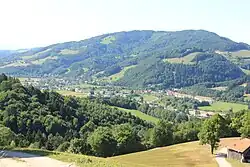 Das östliche Gölsental vom Staff (Berg bei St. Veit) aus gesehen. Im Bild die Orte Rainfeld, Bernreit und ganz hinten Rohrbach